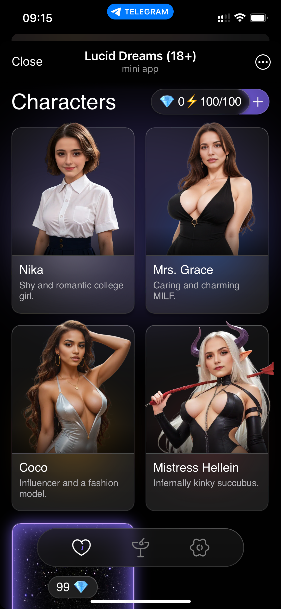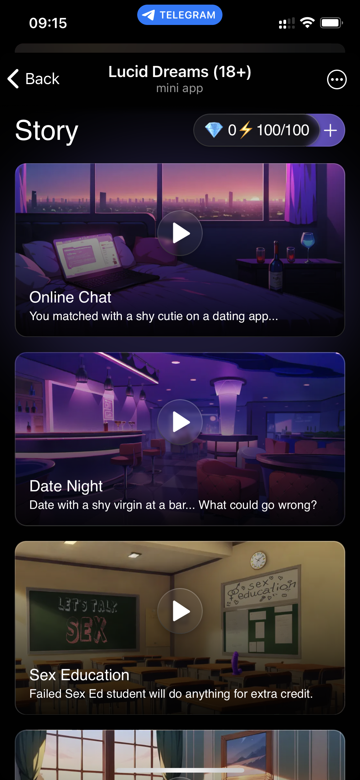 Lucid Dreams (18+) — Telegram ichida ishlashga mo‘ljallangan mini ilova bo‘lib, foydalanuvchilar hikoya asosidagi suhbatlar orqali virtual qahramonlar bilan muloqot qiladigan interaktiv AI chat o‘yini sifatida yaratilgan. An’anaviy o‘yin mexanikalari o‘rniga, tajriba dialog, tanlovlar va qahramonlar bilan o‘zaro aloqaga e’tibor qaratadi.