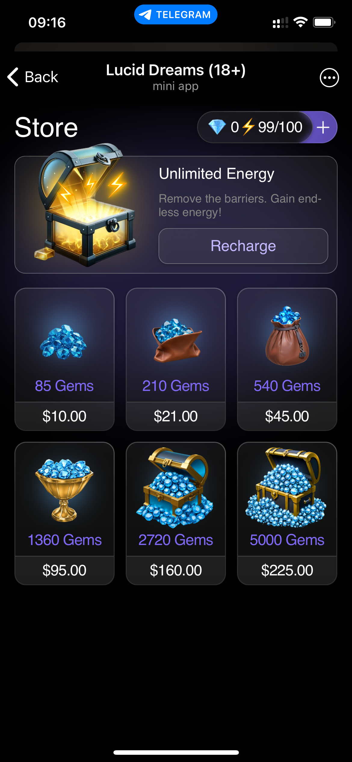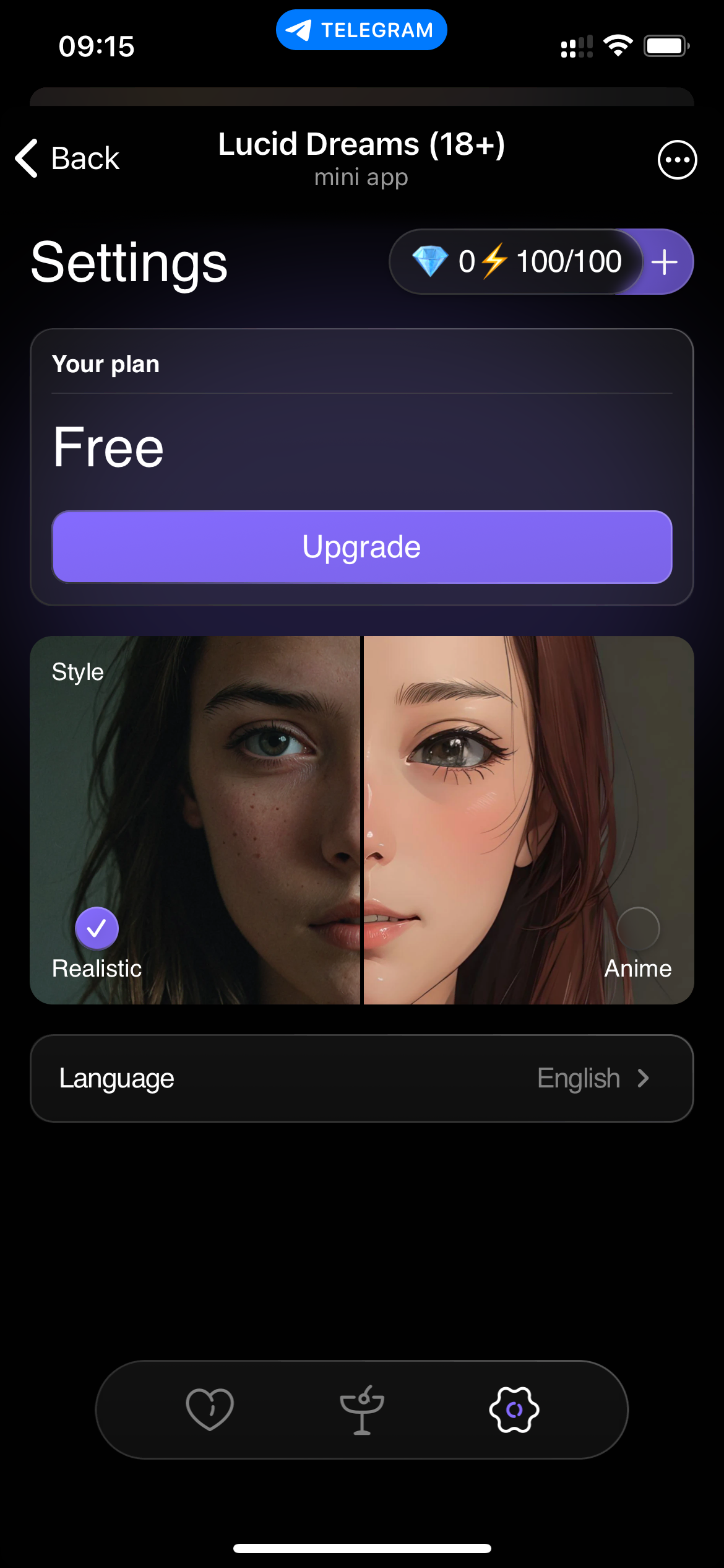 Lucid Dreams interfeysi toza, zamonaviy va Telegram ichidagi mobil ekranlar uchun aniq optimallashtirilgan. Ilova yorqin gradient aksentlar bilan uyg‘unlashgan qorong‘i mavzudan foydalanadi, bu esa interfeysga sayqallangan va biroz futuristik tus beradi.