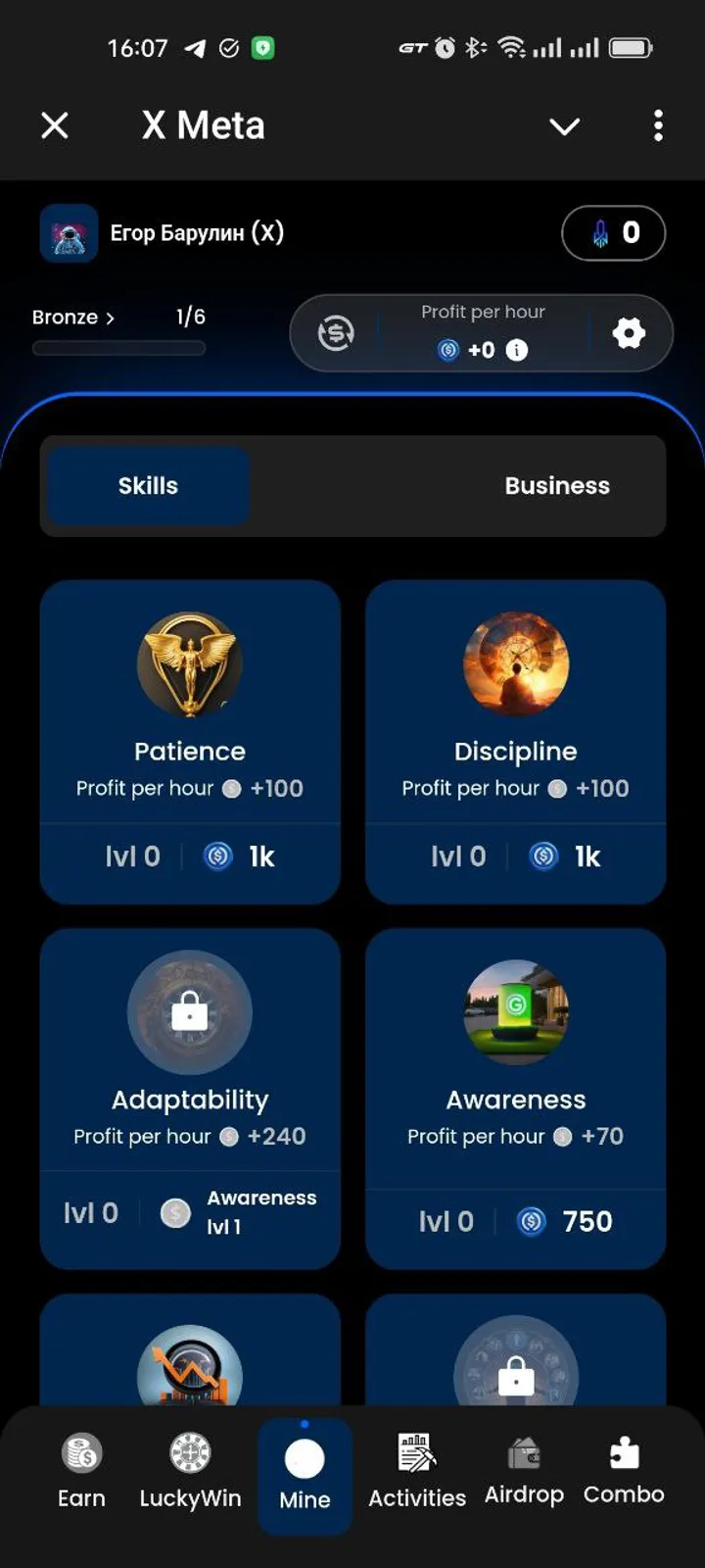 Ko‘nikmalar tizimi Sabr, Intizom va Hushyorlik kabi variantlarni o‘z ichiga oladi va ularning har biri soatiga yaratiladigan META miqdorini oshirishni va’da qiladi. Bu yangilanishlar o‘yin ichidagi valyutani talab qiladi, bu esa yuqoriroq daromad stavkalarini ochish uchun doimiy bosish va “grind” qilishga undaydi.